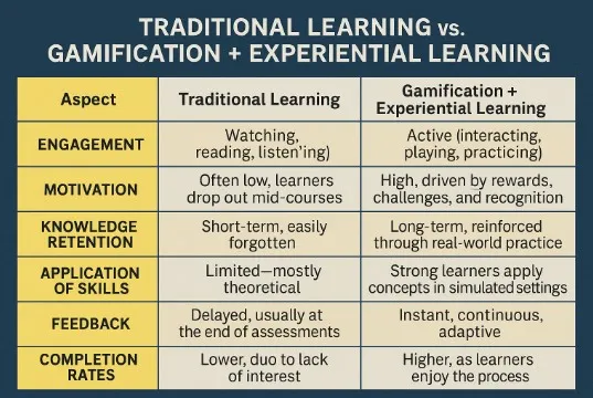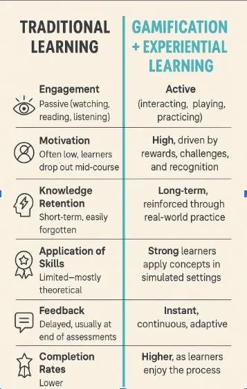 Gamification adds elements like points, leaderboards, rewards, and challenges. Experiential learning, on the other hand, places learners in real-world scenarios where they can practice skills safely. When combined, these two approaches create learning that is not just informational but transformational.